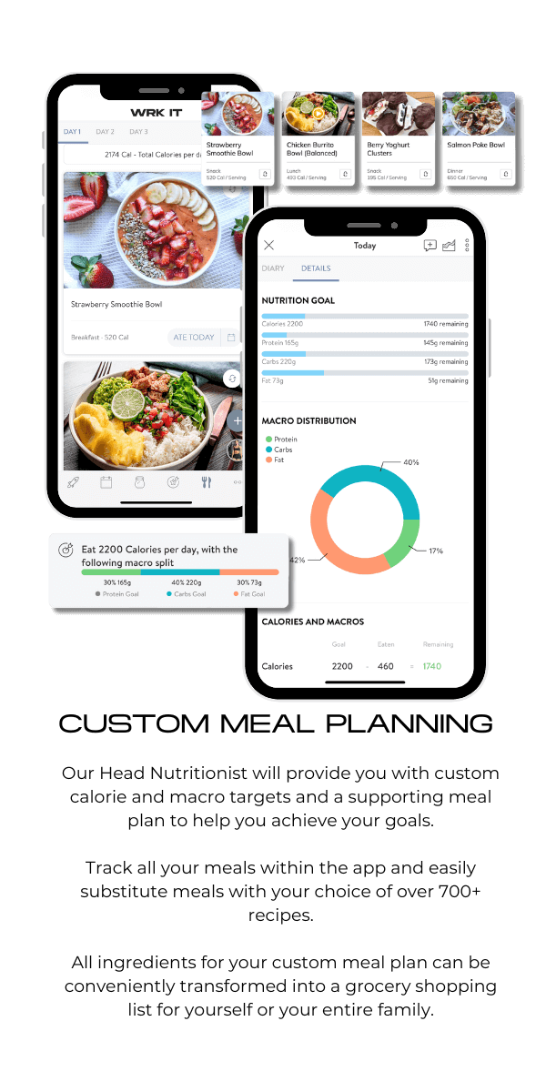 The WRK IT custom nutrition coaching process involves an initial assessment to understand your goals and challenges. From there, your personalised meal plan is created. Fortnightly check-ins are scheduled to provide guidance, support and updated meal plans/adjustments.